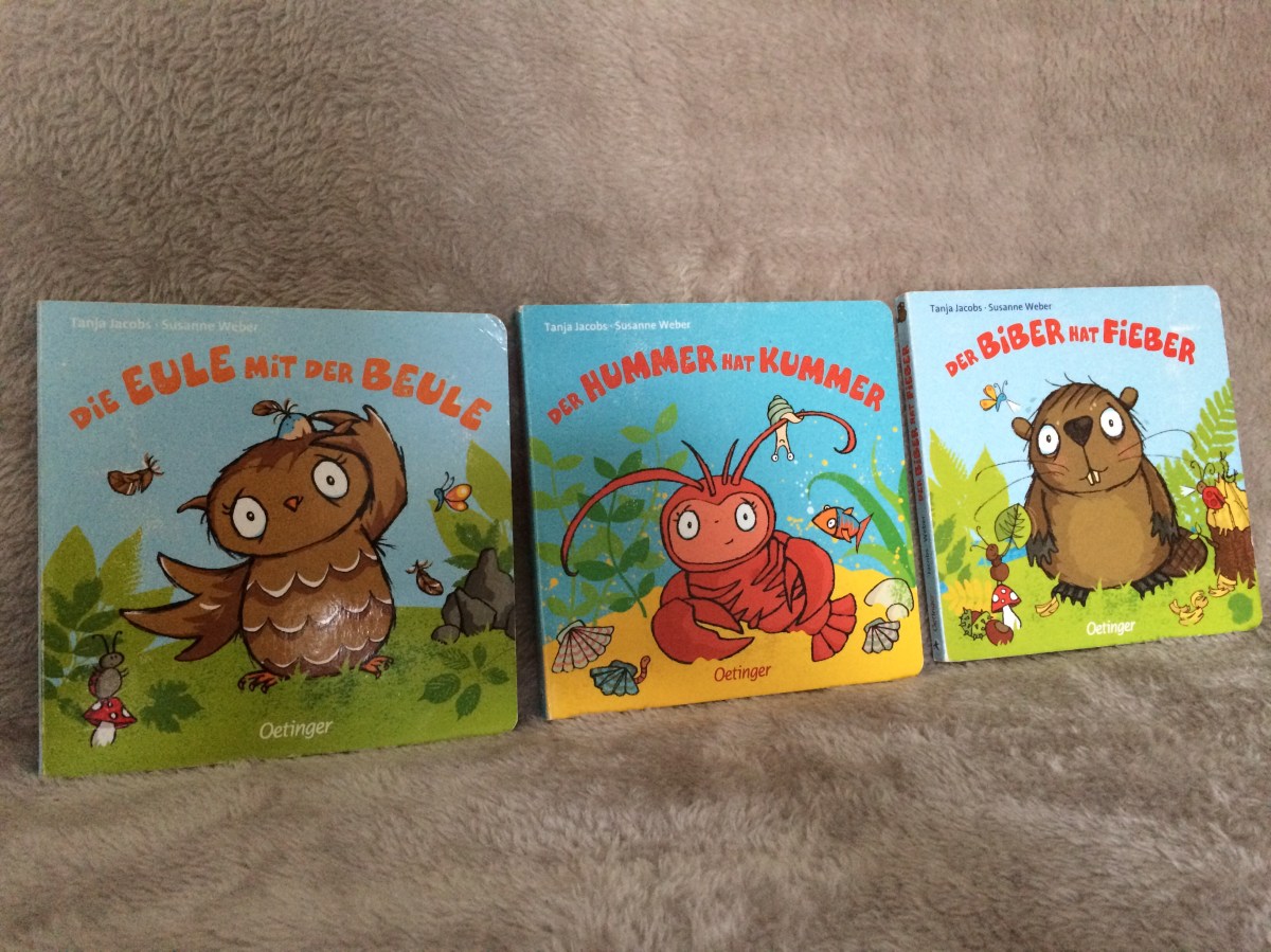 Allein die Titel stechen schon aus dem Regal in der Buchhandlung hervor: Die Eule mit der Beule, der Biber hat Fieber und der Hummer hat Kummer. So heißen die drei Bücher. In allen Geschichten widerfährt den Protagonisten ein übles Schicksal, welchem sie sich stellen müssen. Zum Glück sind sie auf ihrem Weg nicht allein, sondern haben Freunde, die sich um sie kümmern: So schwört der Bär bei Beulen auf die Applikation von Honig, Muscheln wollen gerne kuscheln und andere Waldbewohner kredenzen liebevoll Tee und Suppe. Somit ist ein Happy End natürlich garantiert.